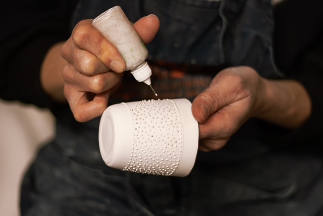 | Technique | Hand formed by slip casting and using porcelain slip for the dots. Glazed on the inside, unglazed on the outside. Fired in a electric kiln for the first time up to 950 degrees Celcius (bisquit) and for the second time un to 1260 degrees Celcius (glazing). High firing makes the porcelain strong and robust. |